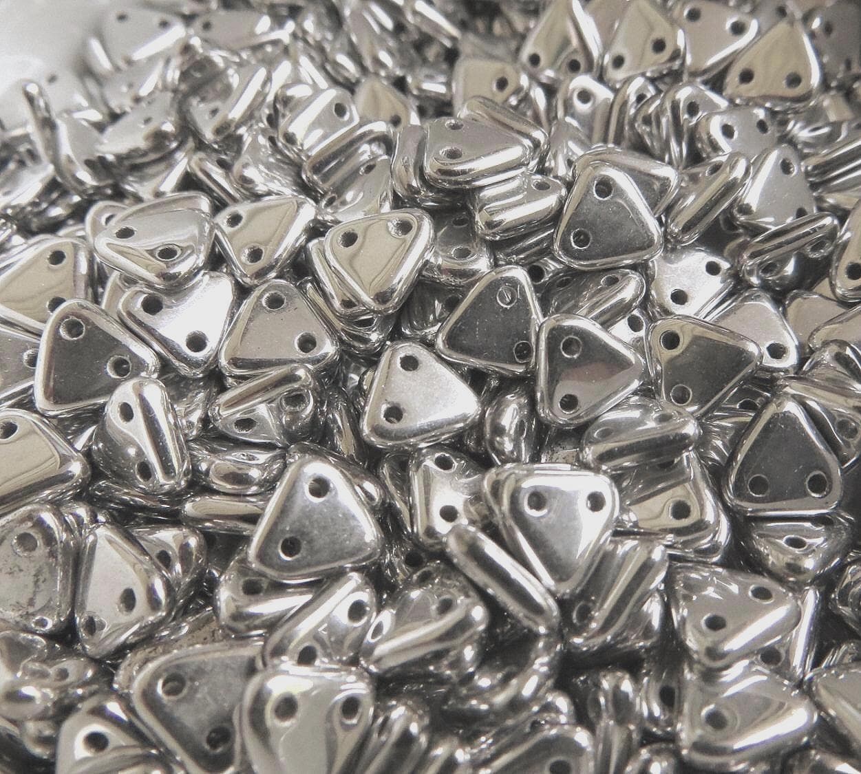 CzechMates™ Triangles are flat beads with two face holes, ideal for adding dimension to jewelry. Each triangle measures 6x6x2mm with precise .85mm holes. They are available in various Czech colors and finishes.