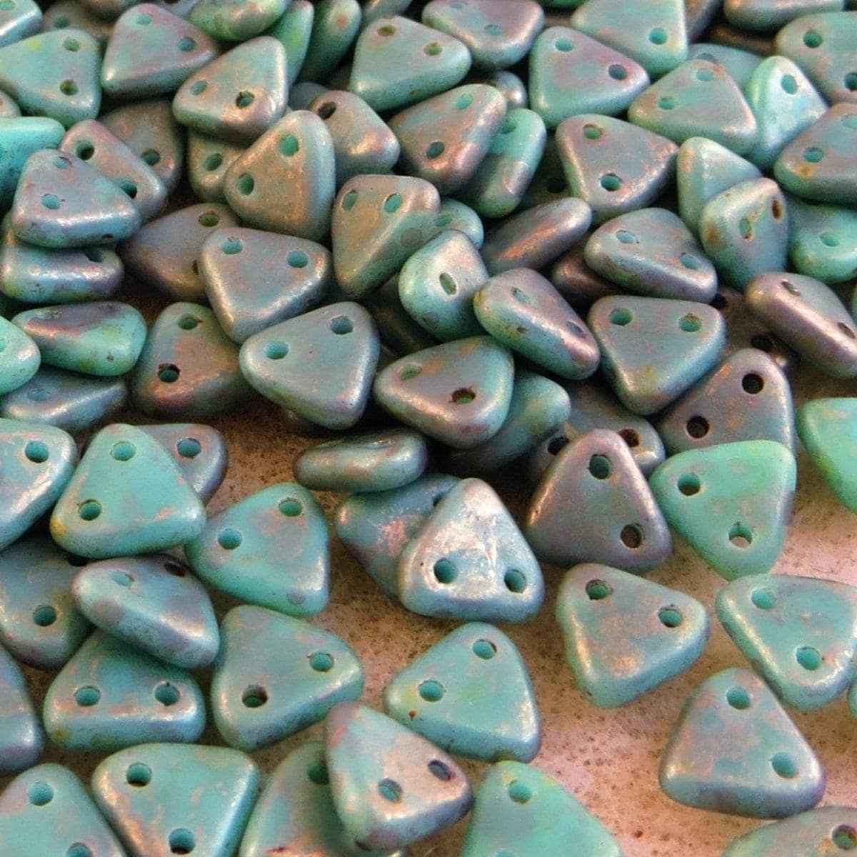 CzechMates™ Triangles are flat beads with two face holes, ideal for adding dimension to jewelry. Each triangle measures 6x6x2mm with precise .85mm holes. They are available in various Czech colors and finishes.