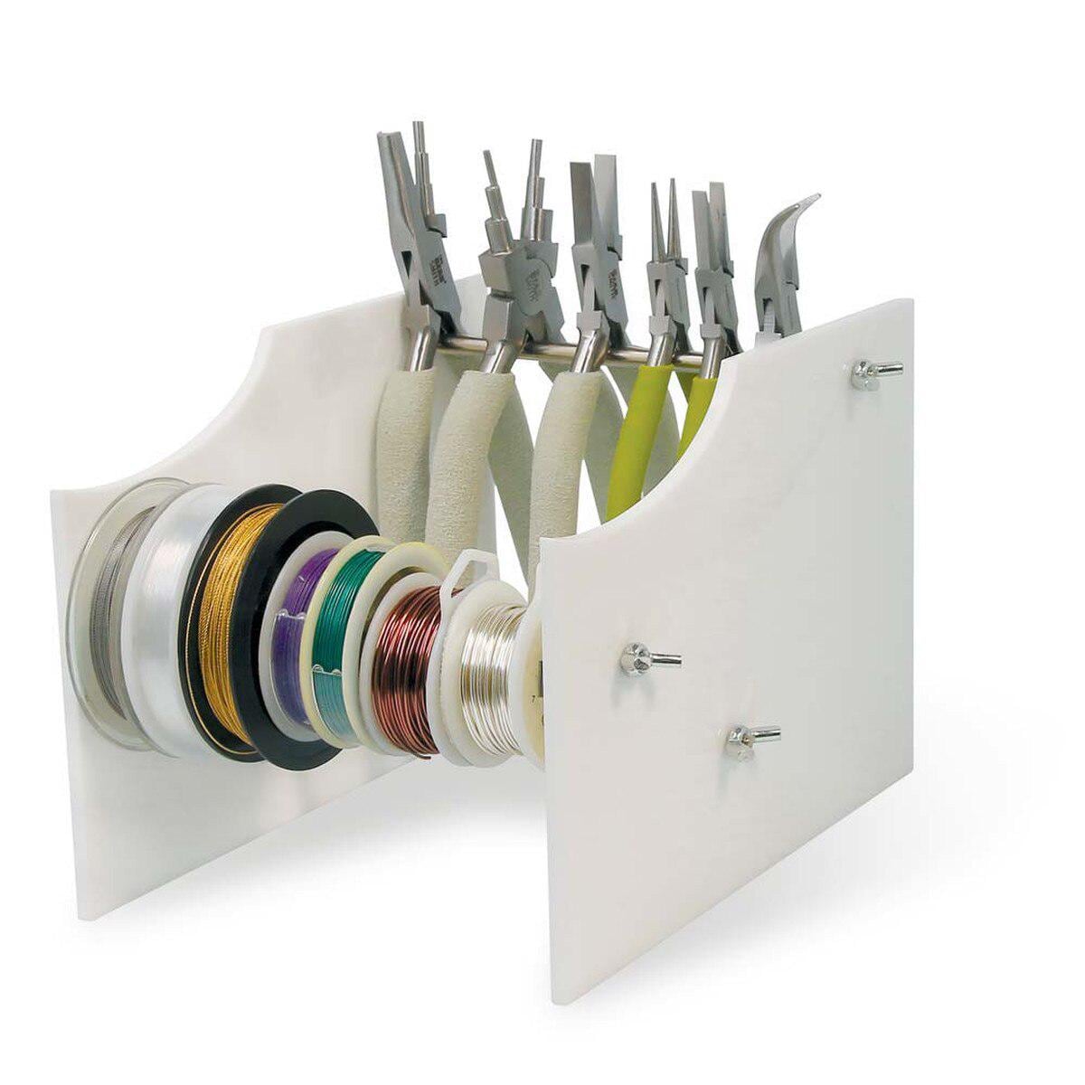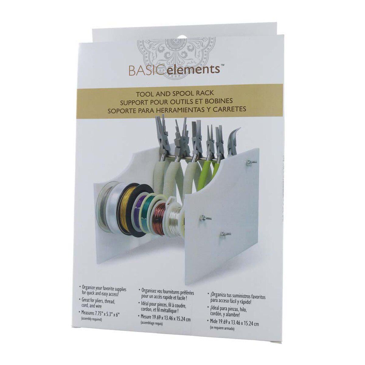 Measuring 7.75” x 5.3” x 6” (19.69cm x 13.46cm x 15.24cm), the Basic Element™ tool and spool rack is designed to hold multiple pliers upright, keeping them organized and within reach. The two rods included for string materials ensure that wire, thread, or cord are always easy to locate, eliminating the hassle of searching for supplies.
