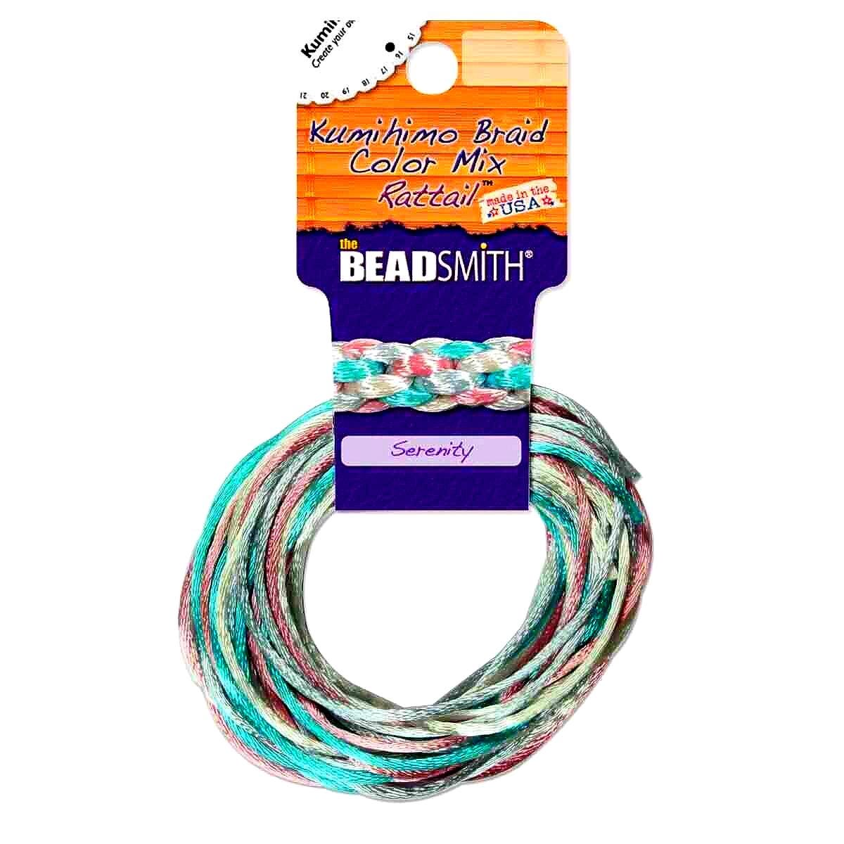 The Beadsmith Rattail cord is a versatile satin-look nylon cord with a cotton core and rayon outer layer, offering a silky look in vivid colors. Soft yet sturdy, it's easy to cut and suitable for jewelry making, crafts, braiding, home décor, clothing trim, and more. It fits most large-hole beads (minimum 2mm diameter) and is commonly used in Kumihimo (Japanese braiding).