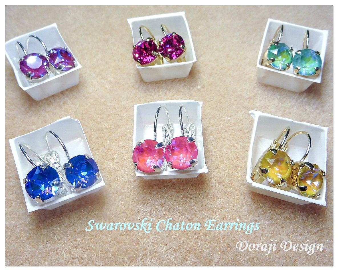 Materials used: German made brass Lever Back component, plated Silver or Gold and 39ss (8mm) Swarovski crystal chatons in various colors.